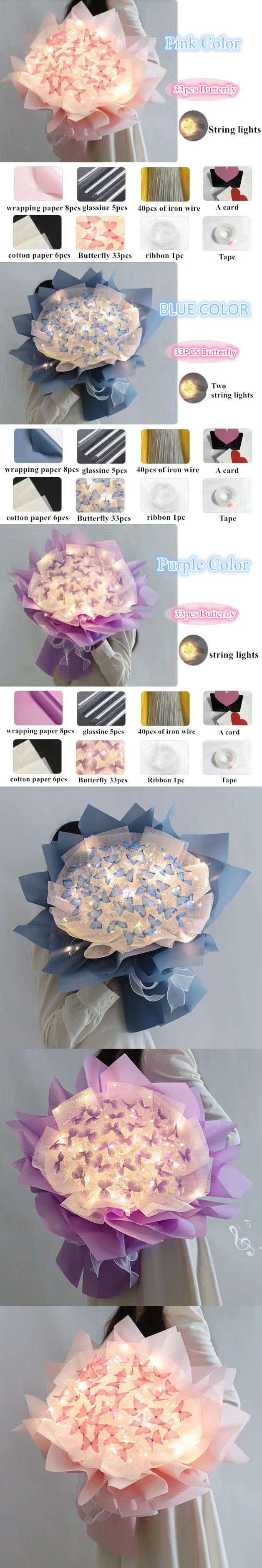 🦋【DIY-vlinderboeketpakket bevat】De verpakking bevat 8 vellen blauw inpakpapier, 5 ladingen zacht cellofaan, 40 stukjes draad, 1 cadeaubon, 6 stukjes katoenpapier, 33 vlinders, 1 stuk lint, 1 stuk tape, 1 stuk LDE-lichtsnoer. De levensechte vlinders voegen een gevoel van animatie toe aan het boeket, dat specialer en aantrekkelijker is dan de gebruikelijke boeketten.
